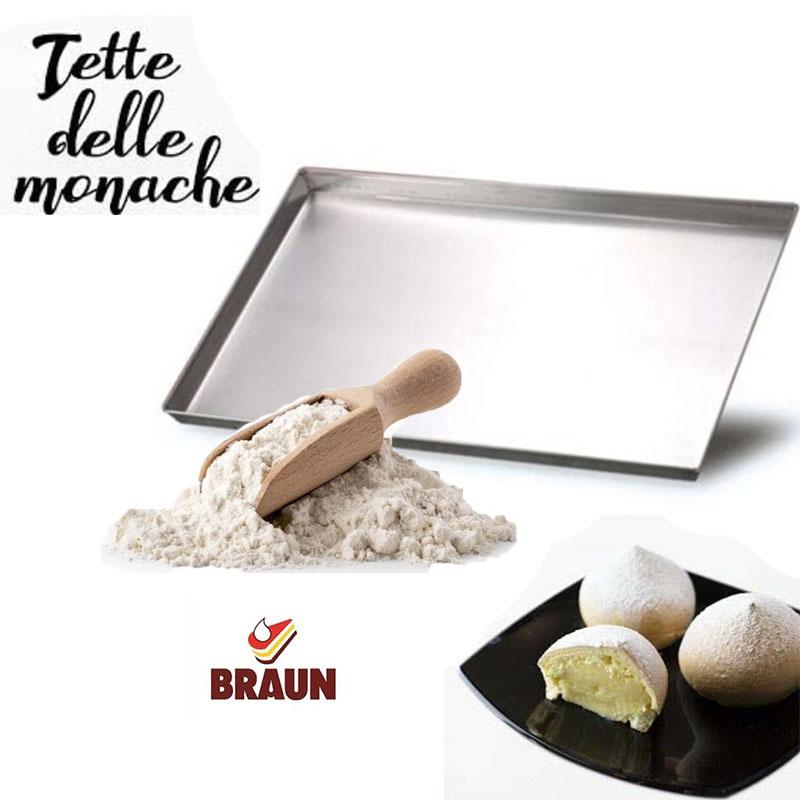 Impastare tutti gli ingredienti in planetaria con frusta a palla per 5 minuti ad alta velocità. Colare l’impasto con bocchetta liscia su una teglia. Cuocere a 160°C per 20-25 min. con valvola e tiraggio dell’aria aperti. Dopo la cottura, lasciar raffreddare, coprire con un cellophane e riporre in frigorifero per una notte. Farcire con crema Chantilly 2 ore prima della vendita. Cospargere di zucchero a velo.