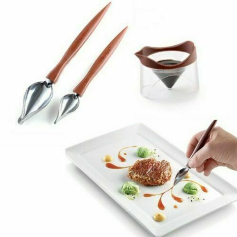 Spoon Decor :Recipiente per salse dolci e salate, creme, cioccolato, dotato di beccuccio in silicone ideato per evitare sbavature in fase di utilizzo. La sua particolare forma conica lo rende ideale ad un utilizzo coordinato con i due Spoon Decor, che permette di realizzare impeccabili decorazioni al piatto.. la confezione contiene solo il recipiente