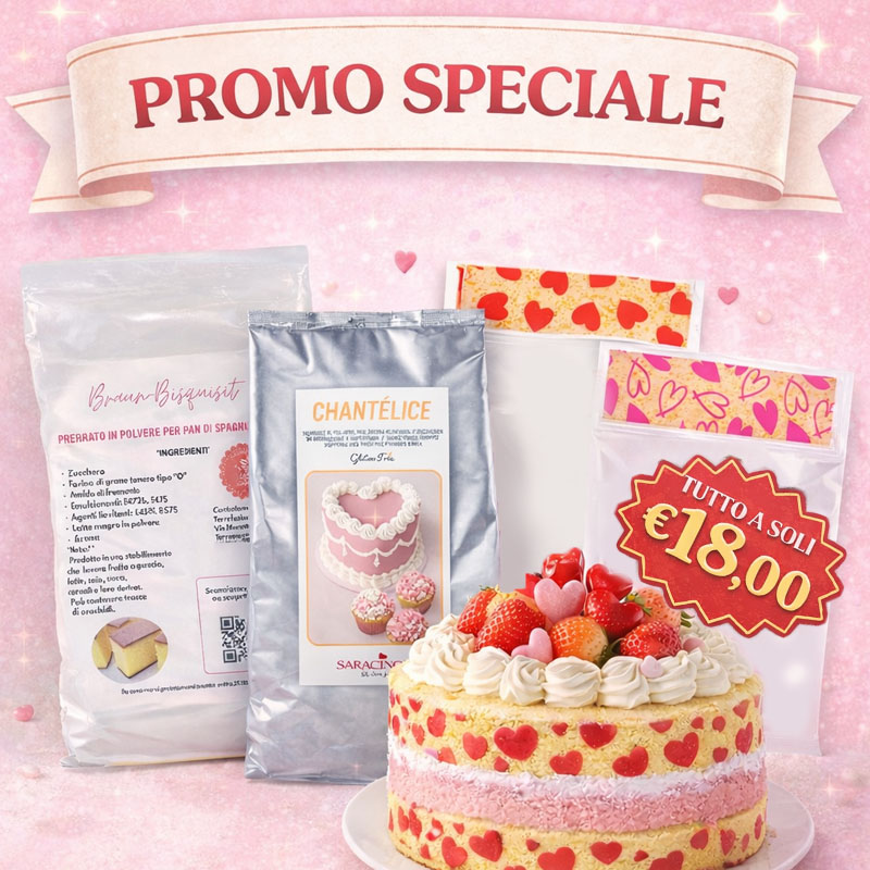 Realizza torte dall’aspetto professionale con il nostro Kit Promo Speciale per Pan di Spagna, una soluzione completa che include il preparato BSquisit 1kg, la celebre CHANTÉLICE Saracino 500g e 2 transfer Modecor a cuoricini per decorazioni eleganti e moderne.