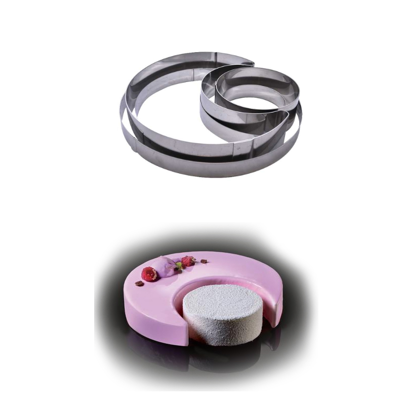 La nuova forma tonda, modello Moon, prende vita diventando un moderno dessert grazie alle fasce inox di diverse misure ed altezze presenti nel kit.