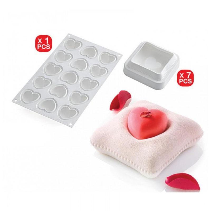 Pensato per i più romantici, TI VOGLIO BENE270 è il kit di Silikomart Professional composto da 7 stampi a forma di cuscino e da uno stampo per 15 mignon a forma di cuore, per realizzare originali preparazioni dal volume totale di 270 ml. I mignon si adagiano perfettamente alle basi a cuscino per creazioni che renderanno inconfondibile la vostra vetrina.;