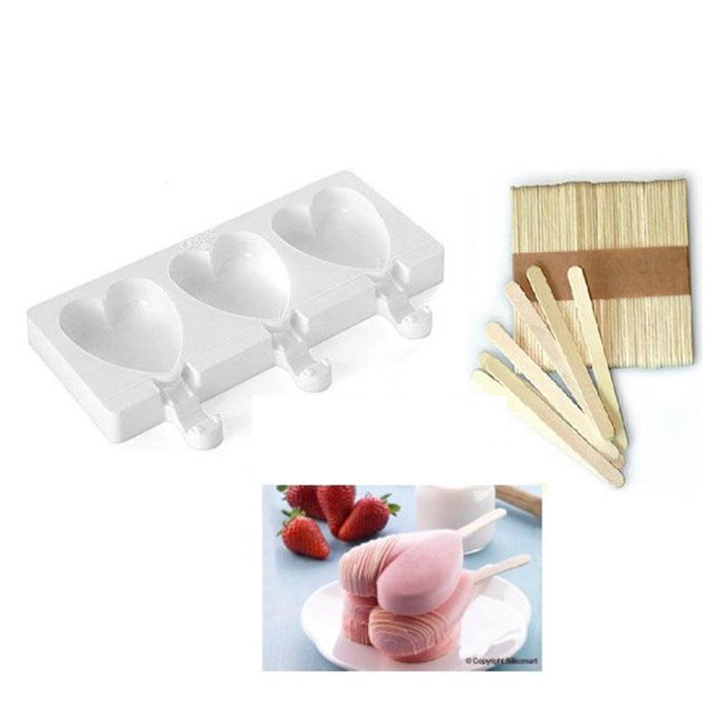 Stampo (3 cavità) per Mini Gelato Cuore con cinquanta stecchi piccoli in legno ed un ricettario di Silikomart.