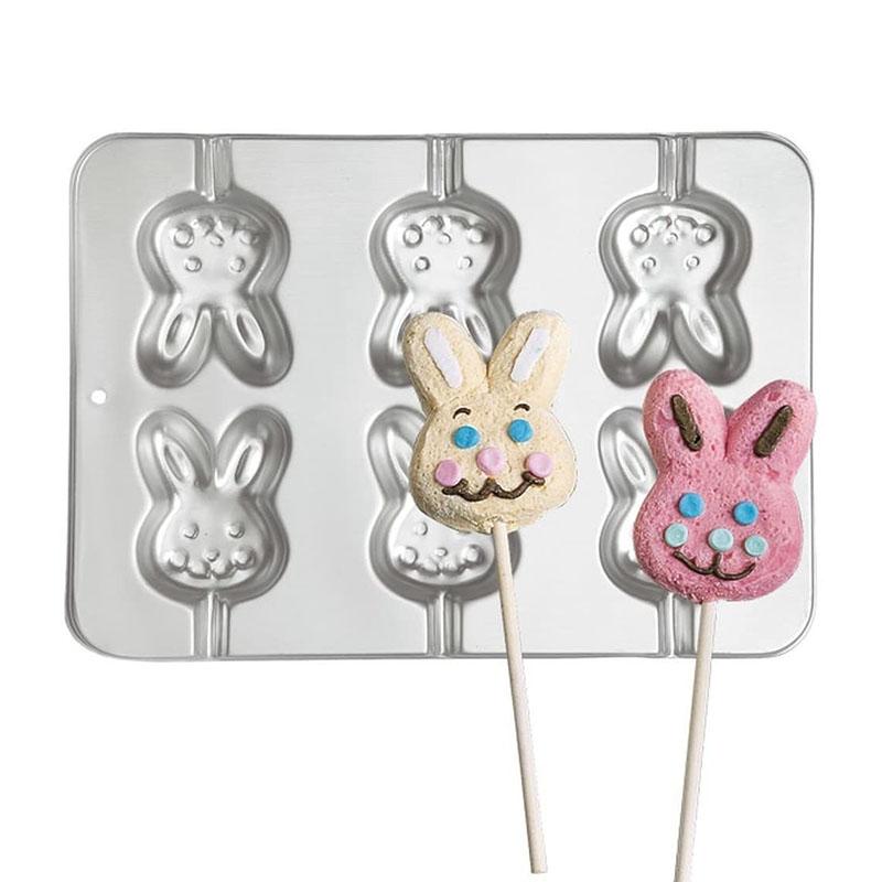 La piastra è in alluminio anodizzato con 6 cavità per realizzare biscotti a forma di coniglio su bastoncino.