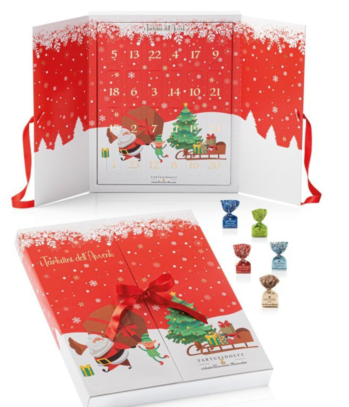 Il Calendario dell’Avvento “Christmas Time” di Antica Torroneria Piemontese è un’idea regalo raffinata e golosa, perfetta per accompagnare l’attesa del Natale. La speciale confezione a forma di libro da sfogliare racchiude al suo interno una selezione di tartufi di cioccolato artigianali, realizzati con ingredienti di alta qualità: nocciole selezionate, pistacchi e cioccolato nelle varianti al latte, bianco, fondente ed extra fondente.