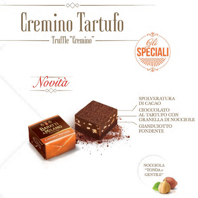 Un cremino semplicemente favoloso. Una speciale ricetta con gianduiotto fondente e granella di nocciole tonda gentile , spolverato di cacao di copertura Un esplosione di gusto