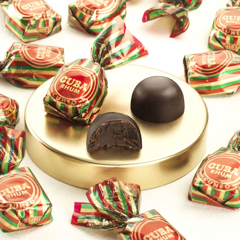 Da una ricetta originale cuneese al rhum, un cioccolatino con guscio fondente 60% ripieno di crema di cioccolato e rhum