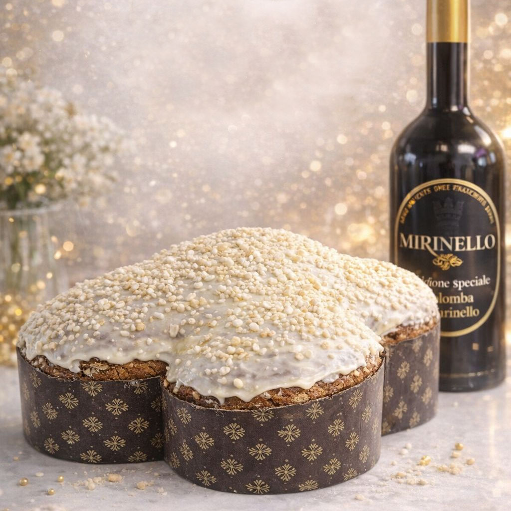 Confezione Idea Regalo Colomba Artigianale al Mirinello con Ganache e Glassa al Cioccolato Bianco + Liquore al Mirinello 50cl