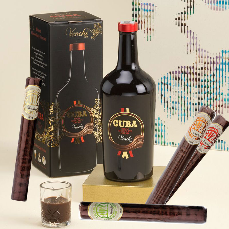 Idea regalo Festa del Papà Botiglia Liquore al Cioccolato e rhum Venchi abbianto ad un sigaro di cioccolato a scelta tra cioccolato Fondente ,Cioccolato al arancia, Cioccolato al pistacchio e Crocante nougatine.
